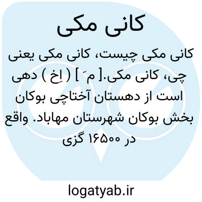 کانی مکی.[ م َ ] ( اِخ ) دهی است از دهستان آختاچی بوکان بخش بوکان شهرستان مهاباد. واقع در 16500 گزی باختری بوکان و 16500 گزی باختر شوسه بوکان به میاندوآب. ناحیه ای است کوهستانی معتدل سالم و دارای 25 تن سکنه. از چشمه مشروب میشود. محصولاتش غلات و توتون است. اهالی به کشاورزی و گله داری گذران میکنند. از صنایع دستی آنان جاجیم بافی است. ( از فرهنگ جغرافیائی ایران ج 4 ).