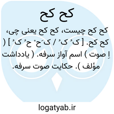 کح کح. [ ک ُ ک ُ / ک َح ْ ح ُ ک ُ ] ( اِ صوت ) اسم آواز سرفه. ( یادداشت مؤلف ). حکایت صوت سرفه. حکایت صوت کحة. اه و اه. سرفان سرفان. سرف سرف.، کحکح. [ ک ُ ک ُ / ک ِ ک ِ ] ( ع ص، اِ ) گنده پیر. ( منتهی الارب ) ( ناظم الاطباء ). زن نیک پیر. ( اقرب الموارد ). || شتر ماده کهنسال فرتوت. ( از منتهی الارب ). شترماده مسن. ( اقرب الموارد ).