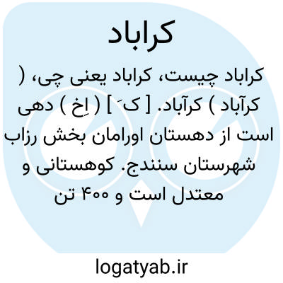 ( کرآباد ) کرآباد. [ ک َ ] ( اِخ ) دهی است از دهستان اورامان بخش رزاب شهرستان سنندج. کوهستانی و معتدل است و 400 تن سکنه دارد. محصولش غلات، لبنیات و توتون و شغل اهالی آنجا زراعت و گله داری است. ( از فرهنگ جغرافیایی ایران ج 5 ).