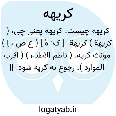 ( کریهة ) کریهة. [ ک َ هََ ] ( ع ص، اِ ) مؤنث کریه. ( ناظم الاطباء ) ( اقرب الموارد ). رجوع به کریه شود. || کار سخت. ( مهذب الاسماء ). || جنگ سخت و سختی جنگ. ( ناظم الاطباء ). جنگ سخت یا سختی جنگ. ( منتهی الارب ) ( از اقرب الموارد ). || حادثه وبلا. ( ناظم الاطباء ) ( منتهی الارب ). نازلة. ( اقرب الموارد ). ج، کرائه [ ک َ ءِ ه ْ ]. ( از اقرب الموارد ).