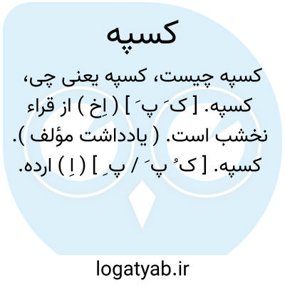 لغت نامه دهخدا کسپه. [ ک َ پ َ ] ( اِخ ) از قراء نخشب است. ( یادداشت مؤلف ).کسپه. [ ک ُ پ َ / پ ِ ] ( اِ ) ارده. کنجاره. ( یادداشت مؤلف ). رجوع به کسب و کسبه شود.