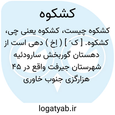 کشکوه. [ ک َ ] ( اِخ ) دهی است از دهستان گوربخش سارودئیه شهرستان جیرفت واقع در 45 هزارگزی جنوب خاوری ساردوئیه و 8 هزارگزی جنوب راه مالروی ساردوئیه به دارزین. ( از فرهنگ جغرافیایی ایران ج 8 ).
