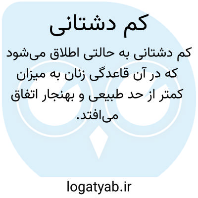 {oligomenorrhea} [پزشکی] دشتانی که مقدار یا دفعات آن کمتر از حالت بهنجار باشد