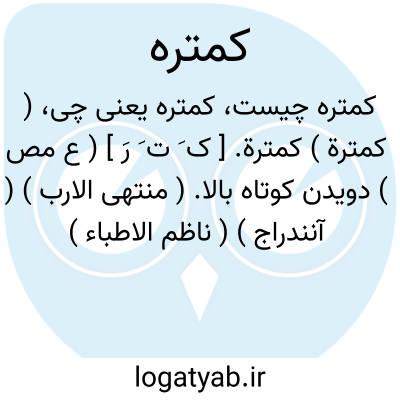 ( کمترة ) کمترة. [ ک َ ت َ رَ ] ( ع مص ) دویدن کوتاه بالا. ( منتهی الارب ) ( آنندراج ) ( ناظم الاطباء ) ( از اقرب الموارد ). || پر کردن مشک را. ( از منتهی الارب ) ( از آنندراج ): کمتر السقاء کمترة؛ پر کرد آن مشک را. ( ناظم الاطباء ) ( از اقرب الموارد ). || به سربند مشک بستن دهان مشک را. ( منتهی الارب ): کمترالقربة؛ با سربند بست دهان آن خیک را. ( ناظم الاطباء ) ( از اقرب الموارد ). || ( اِمص ) نوعی از رفتار که در آن گام نزدیک گذارند. ( منتهی الارب ) ( آنندراج ) ( از ناظم الاطباء ). راه رفتنی که در آن گامها نزدیک باشد و گفته اند معنی آن نوعی دویدن کوتاه بالایی است که گامها نزدیک گذارد و در دویدن بکوشد. ( از اقرب الموارد ).
