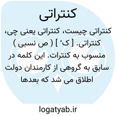 کنتراتی. [ ک ُ ] ( ص نسبی ) منسوب به کنترات. این کلمه در سابق به گروهی از کارمندان دولت اطلاق می شد که بعدها کلمه «پیمانی » را به جای آن برگزیدند.