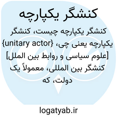 {unitary actor} [علوم سیاسی و روابط بین الملل] کنشگر بین المللی، معمولاً یک دولت، که در نظریۀ واقع گرایی ماهیتی یکپارچه دارد و فرایند تصمیم گیری در سیاست خارجی آن با وجود تغییر در اوضاع سیاسی و جابه جایی تصمیم گیران، پیوسته ثابت است