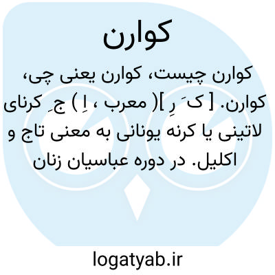 کوارن. [ ک َ رِ ]( معرب، اِ ) ج ِ کرنای لاتینی یا کرنه یونانی به معنی تاج و اکلیل. در دوره عباسیان زنان خلیفه و اعیان رجال تاجی مرصع را که بر سر می نهادند، کرن و جمع آن را کوارن می گفتند. ( یادداشت به خط مرحوم دهخدا ).