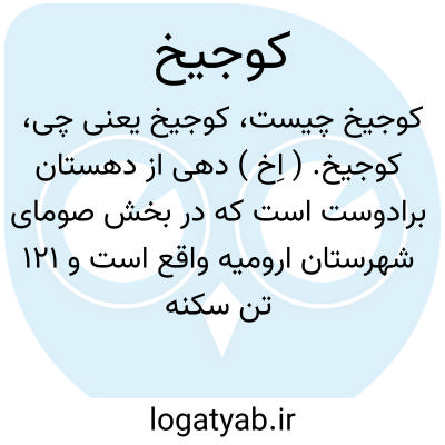 کوجیخ. ( اِخ ) دهی از دهستان برادوست است که در بخش صومای شهرستان ارومیه واقع است و 121 تن سکنه دارد. ( از فرهنگ جغرافیایی ایران ج 4 ).