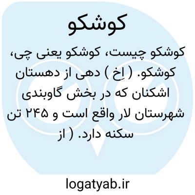کوشکو. ( اِخ ) دهی از دهستان اشکنان که در بخش گاوبندی شهرستان لار واقع است و 245 تن سکنه دارد. ( از فرهنگ جغرافیایی ایران ج 7 ).