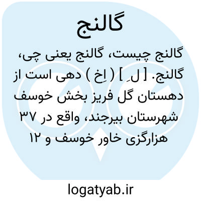 گالنج. [ ل ِ ] ( اِخ ) دهی است از دهستان گل فریز بخش خوسف شهرستان بیرجند، واقع در 37 هزارگزی خاور خوسف و 12 هزارگزی شمال خاوری گل، کوهستانی، هوای آن معتدل، دارای 7 تن سکنه. لهجه آنان فارسی، آب آن از قنات، محصول آنجا غلات، شغل اهالی زراعت و راه آن مالرو است. ( از فرهنگ جغرافیایی ایران ج 9 ).
