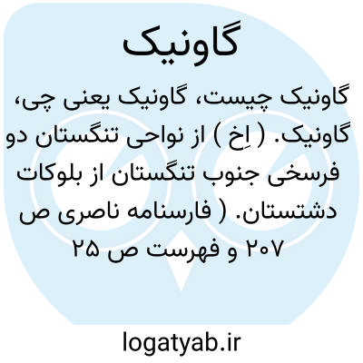 لغت نامه دهخدا گاونیک. ( اِخ ) از نواحی تنگستان دو فرسخی جنوب تنگستان از بلوکات دشتستان. ( فارسنامه ناصری ص 207 و فهرست ص 25 ).