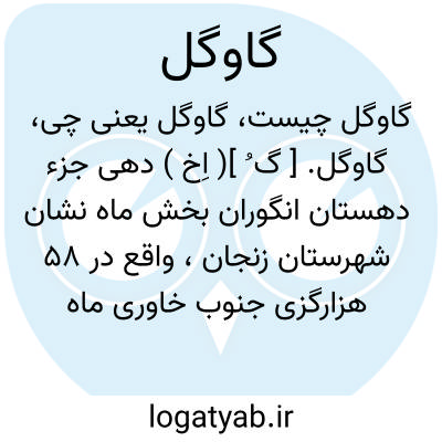 گاوگل. [ گ ُ ]( اِخ ) دهی جزء دهستان انگوران بخش ماه نشان شهرستان زنجان، واقع در 58 هزارگزی جنوب خاوری ماه نشان و 12 هزارگزی راه عمومی. کوهستانی، سردسیر، دارای 305 تن سکنه، اکثر سادات هستند. آب آن از چشمه سار و محصول آن غلات، میوه جات. شغل اهالی آنجا زراعت، گلیم بافی. راه آنجا مالرو است. ( از فرهنگ جغرافیایی ایران ج 2 ).