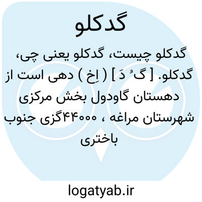 گدکلو. [ گ ُ دَ ] ( اِخ ) دهی است از دهستان گاودول بخش مرکزی شهرستان مراغه، 44000گزی جنوب باختری مراغه و 2000گزی خاور راه شوسه مراغه به میاندوآب. آب و هوای آن جلگه، معتدل مالاریائی است. 364 تن سکنه دارد. آب از رودخانه لیلان، قنات و چشمه تأمین میشود. محصول آن غلات، چغندر، کشمش، بادام و نخود می باشد. شغل اهالی زراعت و صنایع دستی جاجیم بافی است.راه مالرو دارد. ( از فرهنگ جغرافیایی ایران ج 4 ).