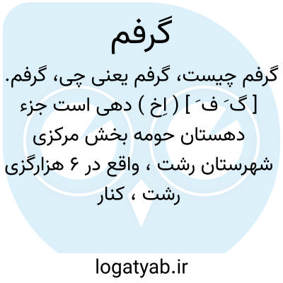 گرفم. [ گ َ ف َ ] ( اِخ ) دهی است جزء دهستان حومه بخش مرکزی شهرستان رشت، واقع در 6 هزارگزی رشت، کنار شوسه رشت به بندر انزلی. هوای آن معتدل و مرطوب است. دارای 505 تن سکنه است. آب آنجا از نهر خمام رود از سفیدرودتأمین میشود. محصول آن برنج و ابریشم و صیفی و شغل اهالی زراعت است و دارای 6 باب قهوه خانه و دکان کنار راه شوسه دارد. ( از فرهنگ جغرافیایی ایران ج 2 ).