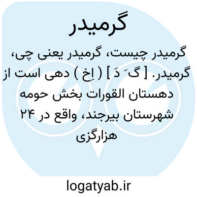 گرمیدر. [ گ َ دَ ] ( اِخ ) دهی است از دهستان القورات بخش حومه شهرستان بیرجند، واقع در 24 هزارگزی شمال بیرجند. هوای آن معتدل و دارای 68 تن سکنه است. آب آنجا از قنات تأمین میشود. محصول آن عناب و شغل اهالی زراعت و راه آن مالرو است. ( فرهنگ جغرافیایی ایران ج 9 ).