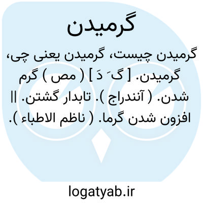 گرمیدن. [ گ َ دَ ] ( مص ) گرم شدن. ( آنندراج ). تابدار گشتن. || افزون شدن گرما. ( ناظم الاطباء ).