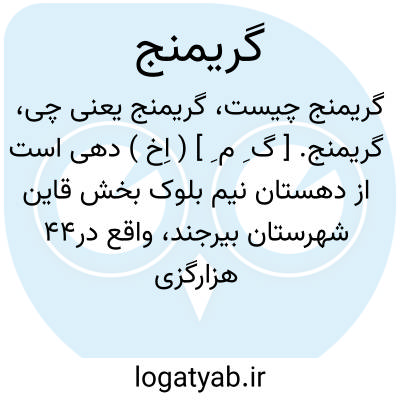 گریمنج. [ گ ِ م ِ ] ( اِخ ) دهی است از دهستان نیم بلوک بخش قاین شهرستان بیرجند، واقع در44 هزارگزی شمال باختری قاین سر راه شوسه قاین به گناباد. هوای آن معتدل و دارای 675 تن سکنه است. آب آنجا از رودخانه و قنات تأمین میشود و محصول آن غلات و تریاک و زعفران و شغل اهالی زراعت و مالداری و راه آن اتومبیل رو است. ( فرهنگ جغرافیائی ایران ج 9 ).