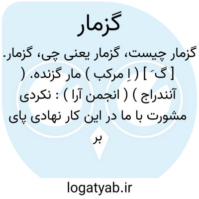 لغت نامه دهخدا گزمار. [ گ َ ] ( اِ مرکب ) مار گزنده. ( آنندراج ) ( انجمن آرا ): نکردی مشورت با ما در این کارنهادی پای بر دنبال گزمار.نزاری قهستانی.