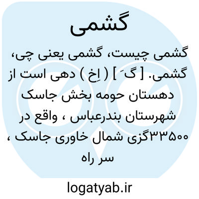 گشمی. [ گ َ ] ( اِخ ) دهی است از دهستان حومه بخش جاسک شهرستان بندرعباس، واقع در 33500گزی شمال خاوری جاسک، سر راه مالرو چاه بهار به جاسک. هوای آن گرم و 200 تن سکنه دارد. آب آنجا از رودخانه و محصول آن غلات و خرماست. شغل اهالی زراعت و راه آن مالرو است. ( از فرهنگ جغرافیایی ایران ج 8 ).