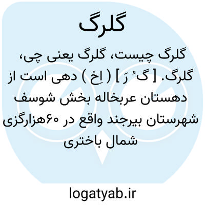 گلرگ. [ گ ُ رَ ] ( اِخ ) دهی است از دهستان عربخاله بخش شوسف شهرستان بیرجند واقع در 60هزارگزی شمال باختری شوسف و 4هزارگزی جنوب خاوری هشتوکان. هوای آن معتدل و دارای 41 تن سکنه است. آب آن از قنات و محصول آن غلات و شغل اهالی زراعت و مالداری است. راه مالرو دارد. ( از فرهنگ جغرافیایی ایران ج 9 ).