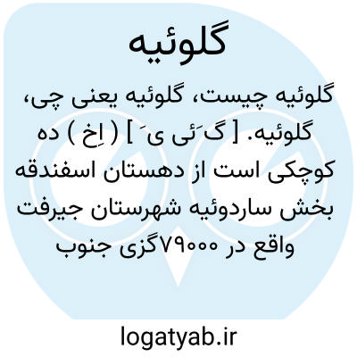 گلوئیه. [ گ َ ئی ی َ ] ( اِخ ) ده کوچکی است از دهستان سیاه کوه بخش بافت شهرستان سیرجان واقع در 97000گزی جنوب بافت، سر راه مالرو کوشک به ده سرد. هوای آن سرد و دارای 15 تن سکنه است. مزرعه ده نو جزء این ده است. ( از فرهنگ جغرافیایی ایران ج 8 ).