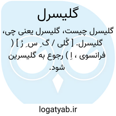 ( اسم ) در تداول به گلیسرین اشتهار دارد و آن مایعی است لزج و بیرنگ و سنگین تر از آب ( وزن مخصوصش ۱/۲۶۵ میباشد ). اگر در آب ریخته شود در زیر آن جمع میگردد. مزه اش شیرین است و با آب و الکل بهر نسبت مخلوط میشود. در ۲۹٠ درجه میجوشد و بسختی جامد میگردد ولی بلور های جامد آن در کمتر از ۱۸ درجه ذوب نمیشوند. این ماده برای نرم کردن پوست و شیرین کردن خمیر دندانها و شربتهای بیماران مبتلا بمرض قند استعمال میگردد. گلیسرل در اکثر چربیها بحالت اترسل موجود است و جزو الکلهای آلی است و دارای سه عامل الکلی میباشد در صنعت برای تهی. گلیسرل معمولا چربیها را با سود محرق میجوشانند مخلوطی از صابون و گلیسرل حاصل میشود. در این مخلوط نمک میریزند صابون رومیایستد و گلیسرل در آب نمک حل میگردد. صابون را بر میدارند و محلول گلیسرل در آب نمک را در خلا (بعلت آنکه نقط. جوش آن پایین آید و بخارات گلیسرل تجزیه نشوند ) تقطیر میکنند.