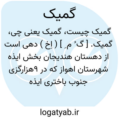 گمیک. [ گ ُ م ِ ] ( اِخ ) دهی است از دهستان هندیجان بخش ایذه شهرستان اهواز که در 9هزارگزی جنوب باختری ایذه واقع شده است.هوای آن معتدل و سکنه اش 120 تن است. آب آن از چشمه تأمین میشود. محصول آن غلات و شغل اهالی زراعت و راه دهکده مالرو است. ( از فرهنگ جغرافیایی ایران ج 6 ).