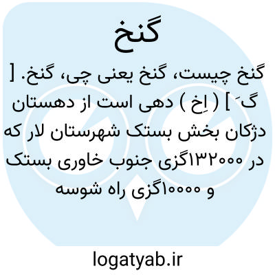 گنخ. [ گ َ ] ( اِخ ) دهی است از دهستان دژکان بخش بستک شهرستان لار که در 132000گزی جنوب خاوری بستک و 10000گزی راه شوسه بستک به لنگه واقع شده است. هوای آن گرم مالاریایی و سکنه اش 416 تن است. آب آن از چاه و باران تأمین میشود. محصول آن غلات و خرما و شغل اهالی زراعت است. ( از فرهنگ جغرافیایی ایران ج 7 ).