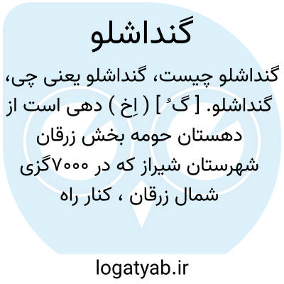 گنداشلو. [ گ ُ ] ( اِخ ) دهی است از دهستان حومه بخش زرقان شهرستان شیراز که در 7000گزی شمال زرقان، کنار راه فرعی پل خان به رامجرد واقع شده است. هوای آن معتدل مالاریایی و سکنه آن 412 تن است. آب آن از چاه تأمین میشود. محصول آن غلات، چغندر و حبوبات وشغل اهالی زراعت و صنایع دستی آنان قالی بافی است. اهالی در دو محل بالا و پائین سکونت دارند. سکنه محل بالائی 231 تن است. ( از فرهنگ جغرافیایی ایران ج 7 ).