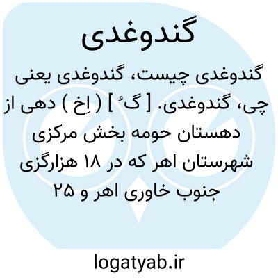 گندوغدی. [ گ ُ ] ( اِخ ) دهی از دهستان حومه بخش مرکزی شهرستان اهر که در 18 هزارگزی جنوب خاوری اهر و 25 هزارگزی شوسه اهر به خیاو واقع شده است. هوای آن معتدل و سکنه اش 94 تن است. آب آن از چشمه تأمین میشود. محصول آن غلات و شغل اهالی زراعت و گله داری و راه آن مالرو است. ( از فرهنگ جغرافیایی ایران ج 4 ).