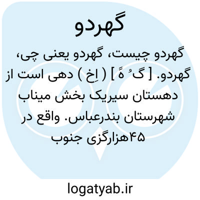 گهردو. [ گ ُ هََ ] ( اِخ ) دهی است از دهستان سیریک بخش میناب شهرستان بندرعباس. واقع در 45هزارگزی جنوب میناب و 7هزارگزی باختر راه مالرو جاسک به میناب. محلی جلگه و هوای آن گرمسیر و سکنه آن 180 تن است. آب آن از چاه تأمین میشود. محصول عمده آن خرما و شغل اهالی زراعت است. ( از فرهنگ جغرافیایی ایران ج 8 ).