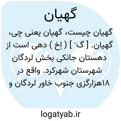 گهیان. [ گ َ ] ( اِخ ) دهی است از دهستان جانکی بخش لردگان شهرستان شهرکرد. واقع در 18هزارگزی جنوب خاور لردگان و 10هزارگزی راه عمومی لردگان به پل کوه. محلی جلگه و جنگل و هوای آن معتدل و سکنه آن 540 تن است. آب آن از چشمه تأمین میشود. محصول عمده ٔآن ارزن، غلات، تنباکو، بادام، میوه جات و برنج است. شغل اهالی زراعت و گله داری و صنایع دستی زنان جاجیم و قالی بافی است. ( از فرهنگ جغرافیایی ایران ج 10 ).