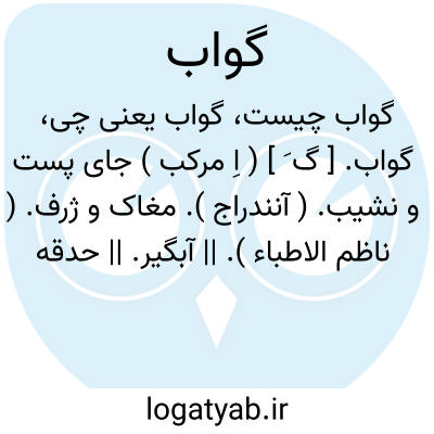 گواب. [ گ َ ] ( اِ مرکب ) جای پست و نشیب. ( آنندراج ). مغاک و ژرف. ( ناظم الاطباء ). || آبگیر. || حدقه چشم. ( آنندراج ). خانه چشم. ( ناظم الاطباء ).