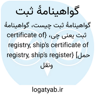 فرهنگستان زبان و ادب {certificate of registry, ship's certificate of registry, ship's register} [حمل ونقل دریایی] مدرکی که ریز مشخصات شناور از قبیل بندر ثبت و شمارۀ ثبت و نام شناور و تابعیت آن و نام و مشخصات مالک و مشخصات موتور در آن نوشته میشود
