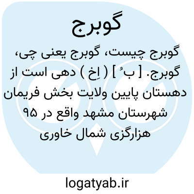 گوبرج. [ ب ُ ] ( اِخ ) دهی است از دهستان پایین ولایت بخش فریمان شهرستان مشهد واقع در 95 هزارگزی شمال خاوری فریمان و 3 هزارگزی جنوب شوسه عمومی مشهد به طبس. در جلگه واقع و هوای آن معتدل است. 222 تن سکنه دارد. آب آن از قنات تأمین میشود. محصول آن غلات، چغندر، و شغل اهالی زراعت و مالداری است. راه مالرو دارد. ( از فرهنگ جغرافیایی ایران ج 9 ).