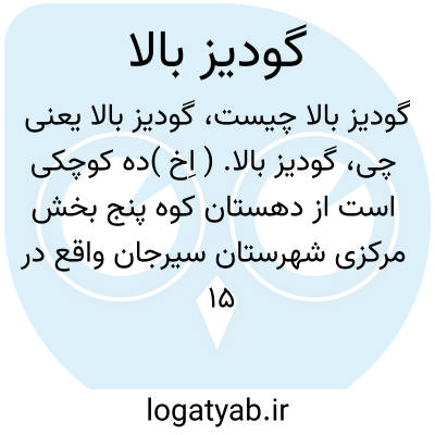 گودیز بالا. ( اِخ )ده کوچکی است از دهستان کوه پنج بخش مرکزی شهرستان سیرجان واقع در 15 هزارگزی خاور سعیدآباد و 2 هزارگزی جنوب راه مالرو حاجی کاکا به تنگو. سکنه آن 33 تن است. مزرعه گود پائین جزء این ده است. ساکنان از طایفه قرانی هستند. ( از فرهنگ جغرافیایی ایران ج 8 ).