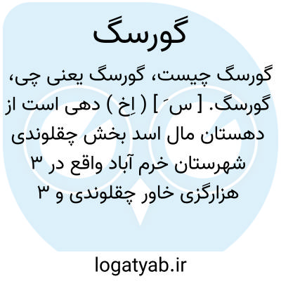 گورسگ. [ س َ ] ( اِخ ) دهی است از دهستان مال اسد بخش چقلوندی شهرستان خرم آباد واقع در 3 هزارگزی خاور چقلوندی و 3 هزارگزی جنوب خاوری شوسه خرم آباد به چقلوندی. تپه ماهور و سردسیر مالاریایی است. سکنه آن 120 تن است. آب آن از چشمه ها تأمین میشود. محصول آن غلات و صیفی و لبنیات و شغل اهالی زراعت و گله داری و صنایع دستی آنان فرش بافی و سیاه چادربافی و راه آن مالرو است. ساکنان از طایفه مال اسد هستند و زمستان به قشلاق میروند. ( از فرهنگ جغرافیایی ایران ج 6 ).