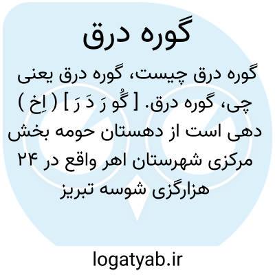 گوره درق. [ گُو رَ دَ رَ ] ( اِخ ) دهی است از دهستان حومه بخش مرکزی شهرستان اهر واقع در 24 هزارگزی شوسه تبریز به اهر. کوهستانی و معتدل و سکنه آن 167 تن. آب آن از چشمه است. محصول آن غلات و حبوب و شغل اهالی زراعت و گله داری و صنایع دستی آنان گلیم بافی و راه آن مالرو است. ( از فرهنگ جغرافیایی ایران ج 4 ).