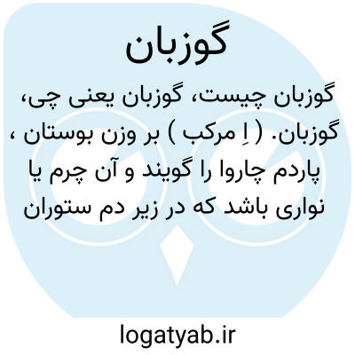 گوزبان. ( اِ مرکب ) بر وزن بوستان، پاردم چاروا را گویند و آن چرم یا نواری باشد که در زیر دم ستوران گذارند. ( برهان ). بندی است که به زیر دم اسب و دیگر ستوران جنس آن افتد استواری زین و پالان را. ( مؤلف ):