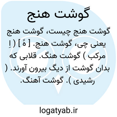 گوشت هنج. [ هََ ] ( اِ مرکب ) گوشت هنگ. قلابی که بدان گوشت از دیگ بیرون آورند. ( رشیدی ). گوشت آهنگ. گوشت آهنج.گوشت ربا. || غلیواج. ( رشیدی ). گوشت ربا.