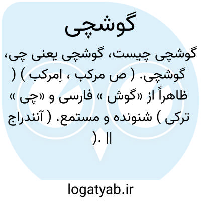 گوشچی. ( ص مرکب، اِمرکب ) ( ظاهراً از «گوش » فارسی و «چی » ترکی ) شنونده و مستمع. ( آنندراج ). || جاسوس. ( آنندراج ).خبرگیر و خبردهنده. ( ناظم الاطباء ). || نگهبان. ( آنندراج ). پاسبان و نگهبان. ( ناظم الاطباء ).
