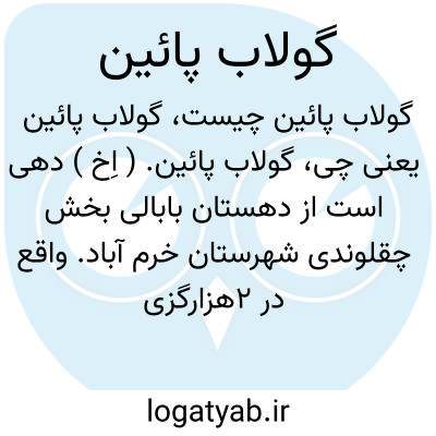گولاب پائین. ( اِخ ) دهی است از دهستان بابالی بخش چقلوندی شهرستان خرم آباد. واقع در 2هزارگزی چقلوندی و یک هزارگزی باختری راه اتومبیل رو چقلوندی به بروجرد. در جلگه واقع و هوای آن سردسیر و سکنه آن 120 تن است. آب آن از رود بابالی و محصول آن غلات، صیفی، لبنیات و پشم است و شغل اهالی زراعت و گله داری و صنایع دستی زنان قالی و سیاه چادر بافی است. راه اتومبیل رو دارد. و ساکنان از طایفه پیرداده بیرانوندند و زمستان به قشلاق میروند. ( از فرهنگ جغرافیایی ایران ج 6 ).