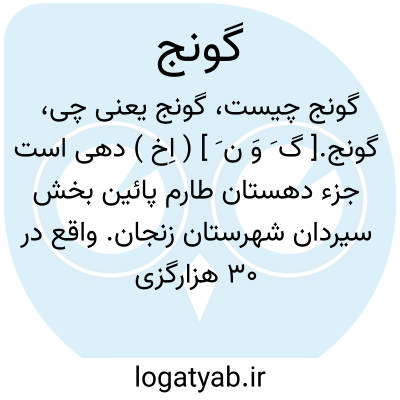 گونج.[ گ َ وَ ن َ ] ( اِخ ) دهی است جزء دهستان طارم پائین بخش سیردان شهرستان زنجان. واقع در 30 هزارگزی جنوب خاوری سیردان و 24 هزارگزی باختر شوسه قزوین به رشت. کوهستانی و هوای آن سردسیر و سکنه آن 329 تن است.آب آنجا از چشمه تأمین میگردد و محصول آن غلات، بنشن، گردو و عسل است. شغل اهالی زراعت است. راه مالرو صعب العبور دارد. ( از فرهنگ جغرافیای-ی ای-ران ج 2 ).