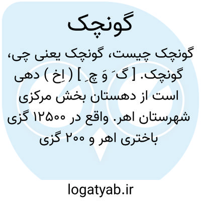 گونچک. [ گ َ وَ چ ِ ] ( اِخ ) دهی است از دهستان بخش مرکزی شهرستان اهر. واقع در 12500 گزی باختری اهر و 200 گزی ارابه رو تبریز به اهر. کوهستانی و هوای آن معتدل مایل به گرمی است. سکنه آن 383 تن است. آب آن از رودخانه اهرچای تأمین میشود. محصول آن غلات، حبوبات و سردرختی و شغل اهالی زراعت و گله داری است. راه مالرو دارد. ( از فرهنگ جغرافیایی ایران ج 4 ).