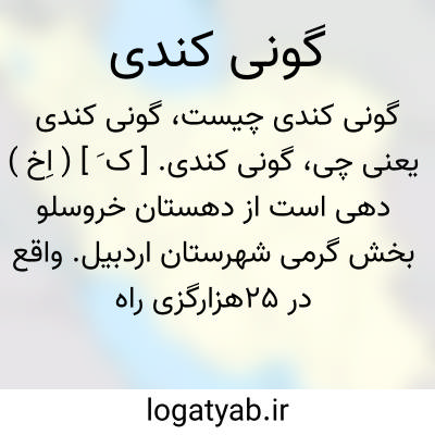گونی کندی. [ ک َ ] ( اِخ ) دهی است از دهستان خروسلو بخش گرمی شهرستان اردبیل. واقع در 25هزارگزی راه شوسه گرمی به اردبیل. کوهستانی و هوای آن گرمسیر و سکنه آن 143 تن است. آب آن از دهات اطراف تأمین میشود. محصول عمده آن غلات و حبوبات دیمی است. و شغل اهالی زراعت و گله داری است. راه مالرو دارد. ( از فرهنگ جغرافیایی ایران ج 4 ).