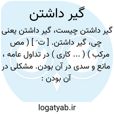 گیر داشتن. [ ت َ ] ( مص مرکب ) (... کاری ) در تداول عامه، مانع و سدی در آن بودن. مشکلی در آن بودن: گیر داشتن در کاری؛ در انجام دادن آن مشکلی دیدن. دشواری و اشکال در برآوردن آن داشتن.