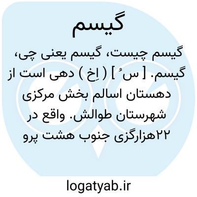 گیسم. [ س ُ ] ( اِخ ) دهی است از دهستان اسالم بخش مرکزی شهرستان طوالش. واقع در 22هزارگزی جنوب هشت پرو 4هزارگزی خاور شوسه انزلی به آستارا. محلی جلگه و هوای آن معتدل و مرطوب و سکنه آن 68 تن است. آب آن از رودخانه کلاسرا تأمین میشود. محصول آن برنج و مختصر ابریشم است. ( از فرهنگ جغرافیایی ایران ج 2 ).