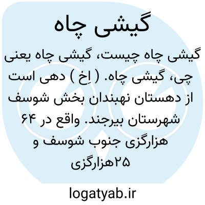 گیشی چاه. ( اِخ ) دهی است از دهستان نهبندان بخش شوسف شهرستان بیرجند. واقع در 64 هزارگزی جنوب شوسف و 25هزارگزی باختر شوسه مشهد به زاهدان. محلی دره و هوای آن گرمسیر و سکنه آن 133 تن است. آب آن از چاه تأمین میشود. محصول آن لبنیات و شغل اهالی مالداری است. بهار مالداران به این ده می آیند. ( از فرهنگ جغرافیایی ایران ج 9 ).