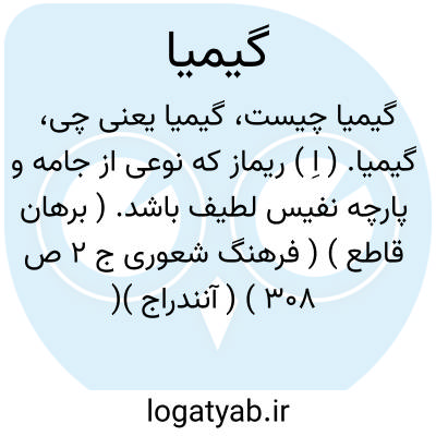گیمیا. ( اِ ) ریماز که نوعی از جامه و پارچه نفیس لطیف باشد. ( برهان قاطع ) ( فرهنگ شعوری ج 2 ص 308 ) ( آنندراج )( ناظم الاطباء ). در نسخه چاپی رشیدی «گیما» آمده و محشی نوشته: «این است در بعضی نسخ مطابق فرهنگ جهانگیری و برهان و نسخه سروری، و در بعضی نسخ رشیدی «گیماز» موافق سراج آمده است. ( حاشیه برهان چ معین ).