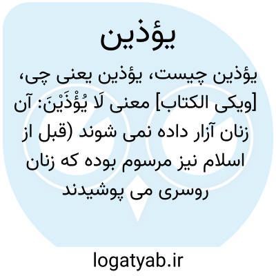 [ویکی الکتاب] معنی لَا یُؤْذَیْنَ: آن زنان آزار داده نمی شوند (قبل از اسلام نیز مرسوم بوده که زنان روسری می پوشیدند ولی پایین آن را پشت سر می انداختند درعبارت "یُدْنِینَ عَلَیْهِنَّ مِن جَلَابِیبِهِنَّ ذَ ٰلِکَ أَدْنَیٰ أَن یُعْرَفْنَ فَلَا یُؤْذَیْنَ" به زنان مؤمن می گوید که طرز روسر...